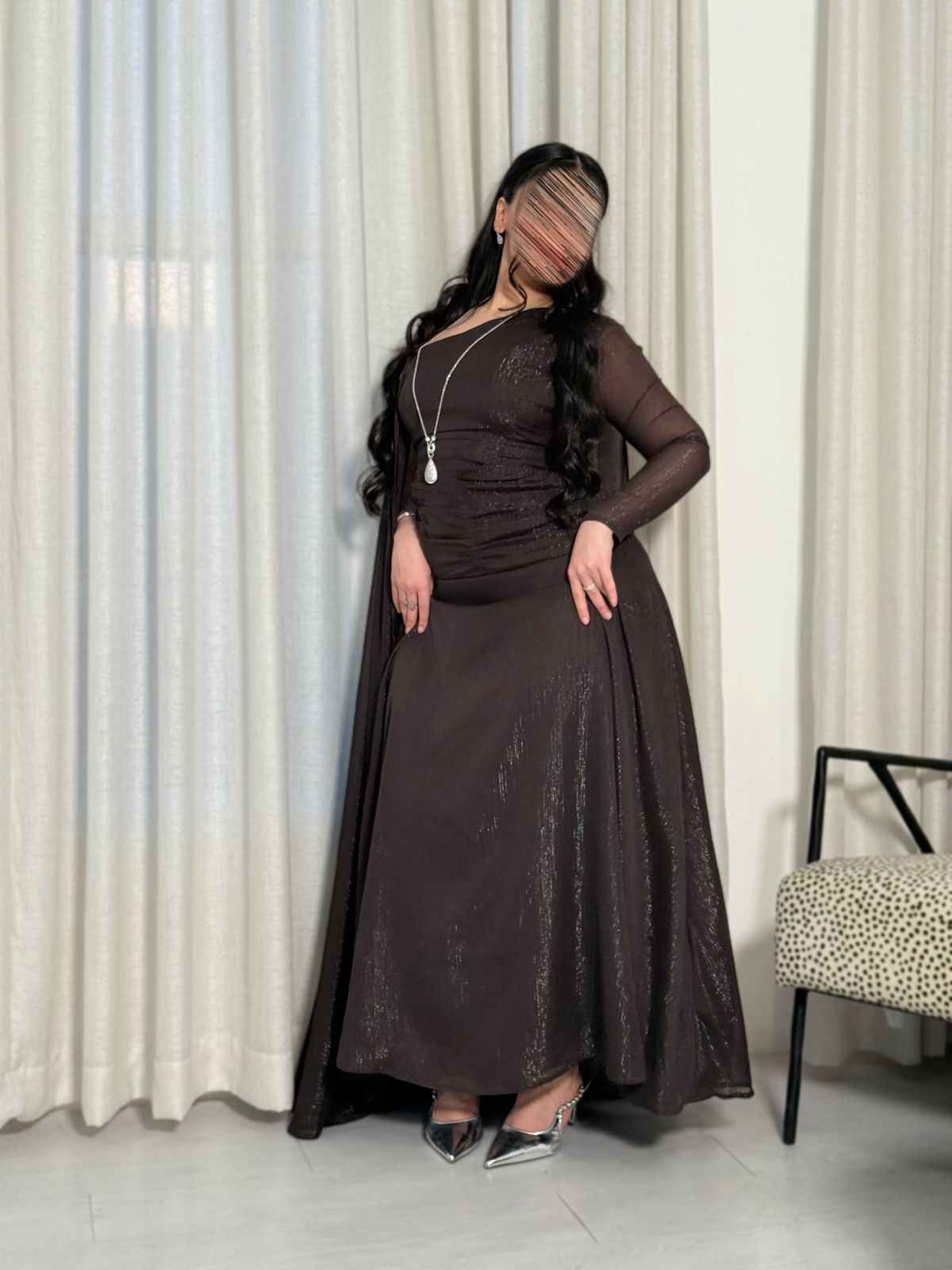 فستان احمر مع كم طويل قص ليزر و صدر مزين بالكريستال